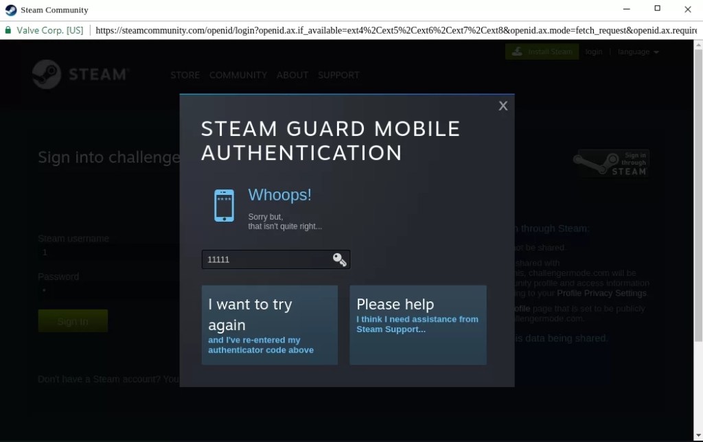 หากผู้ใช้กรอก Username และ Password จะตามมาด้วยหน้ายืนยันตัวตนของ Steam ที่ส่ง OTP ให้ผู้ใช้ ถ้าใส่ข้อมูลถูกต้องจะพาผู้ใช้ไปยังหน้าเว็บไซต์ปลายทาง เพื่อไม่ให้ผู้ใช้สงสัย