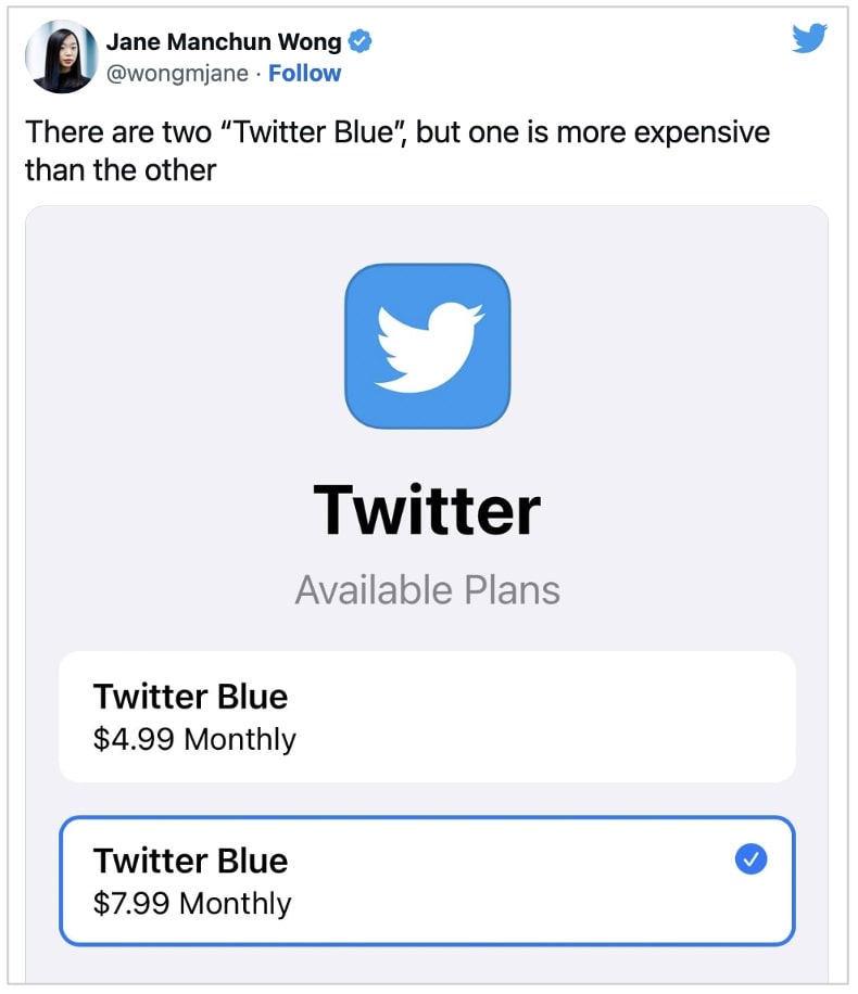 นักวิจัยความปลอดภัยคุณ Jane Manchun Wong พบว่าค่าบริการของ Twitter นั้นไม่ดีแค่ $7.99 เท่านั้น เขายังพบราคาอื่นๆ เช่น $4.99 หรือบางครั้งพบราคา $2.99