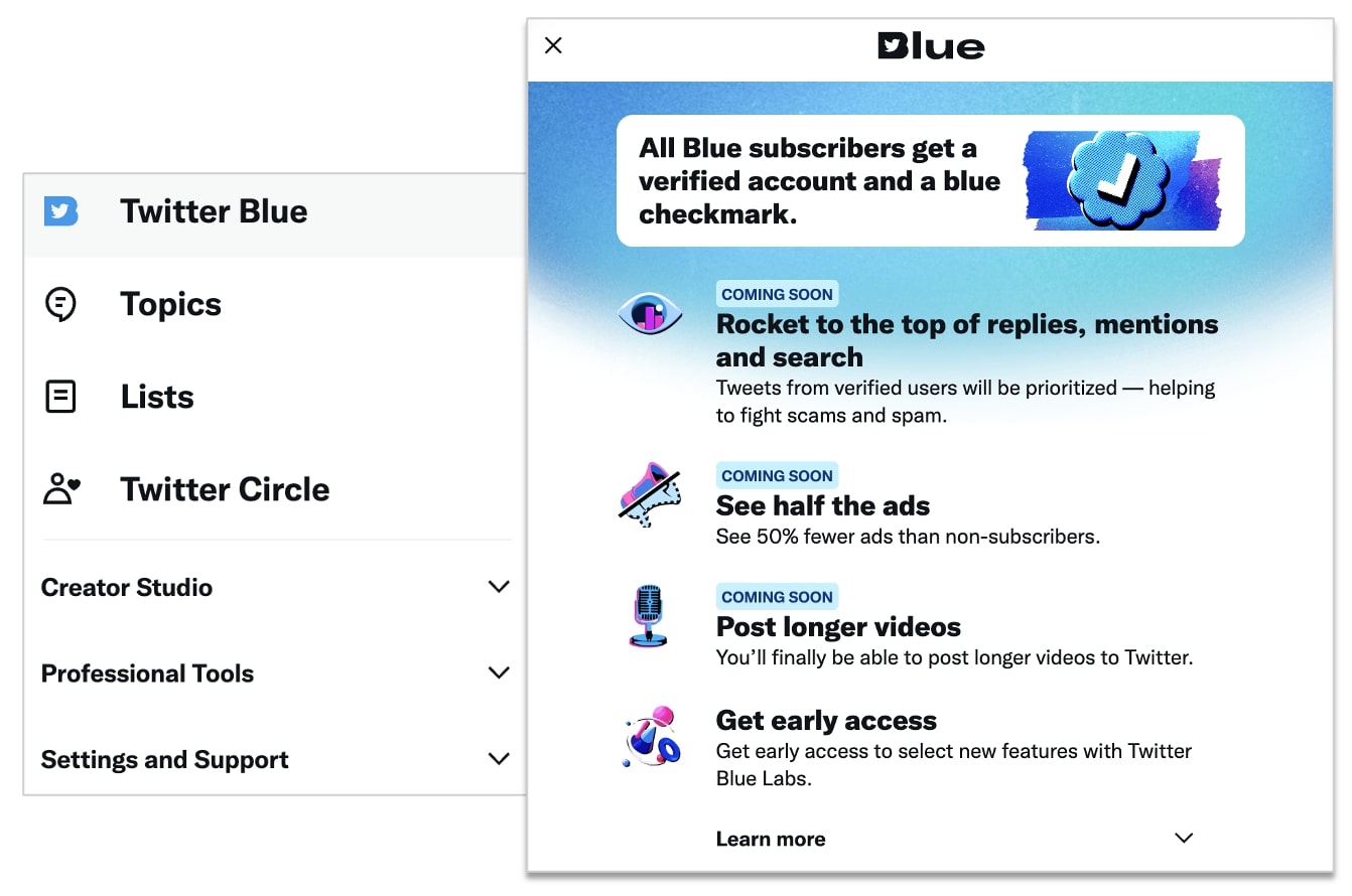 ค่าบริการของ Twitter นอกจากสัญลักษณ์แล้วก็มีสิทธิประโยชน์อีกหลายอย่าง เช่น การจัดอันดับความสำคัญของทวีต โฆษณาที่น้อยลง โพสต์วิดีโอได้ยาวขึ้น